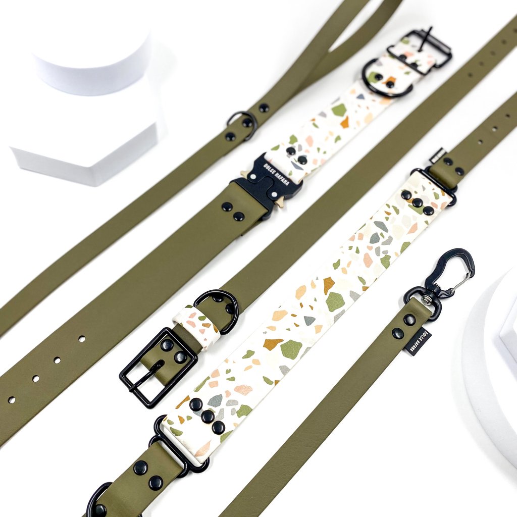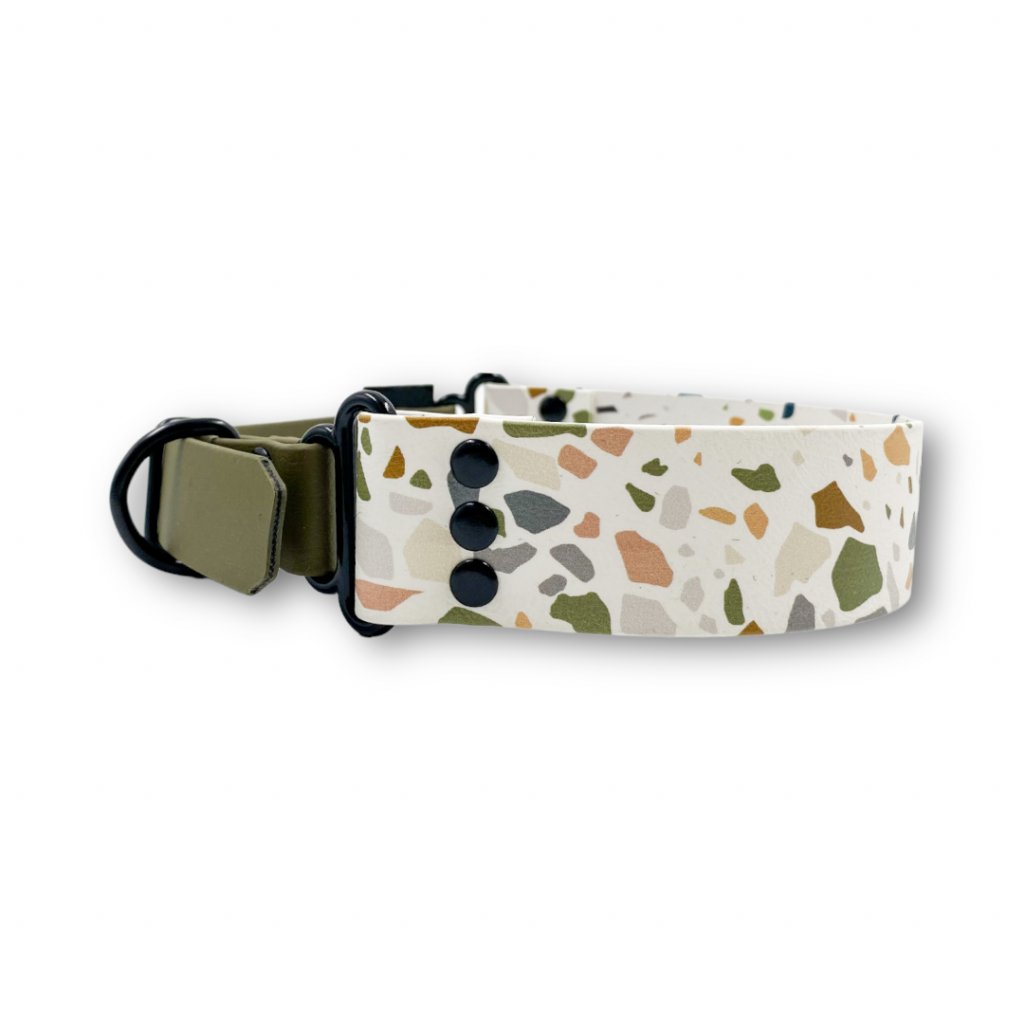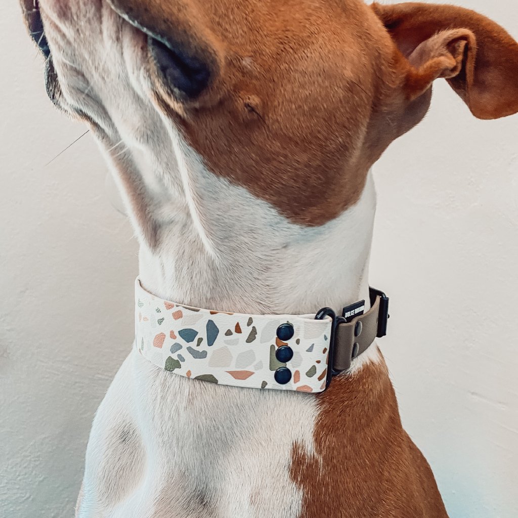 Fernie Terrazzo BioThane široký obojek pro psa od Dolce Hafana kombinuje styl a funkčnost. Voděodpudivý obojek poskytuje pohodlí, kontrolu a bezpečnost pro vašeho psa. Stylový terrazzo design z něj dělá skvělý doplněk pro každou příležitost.