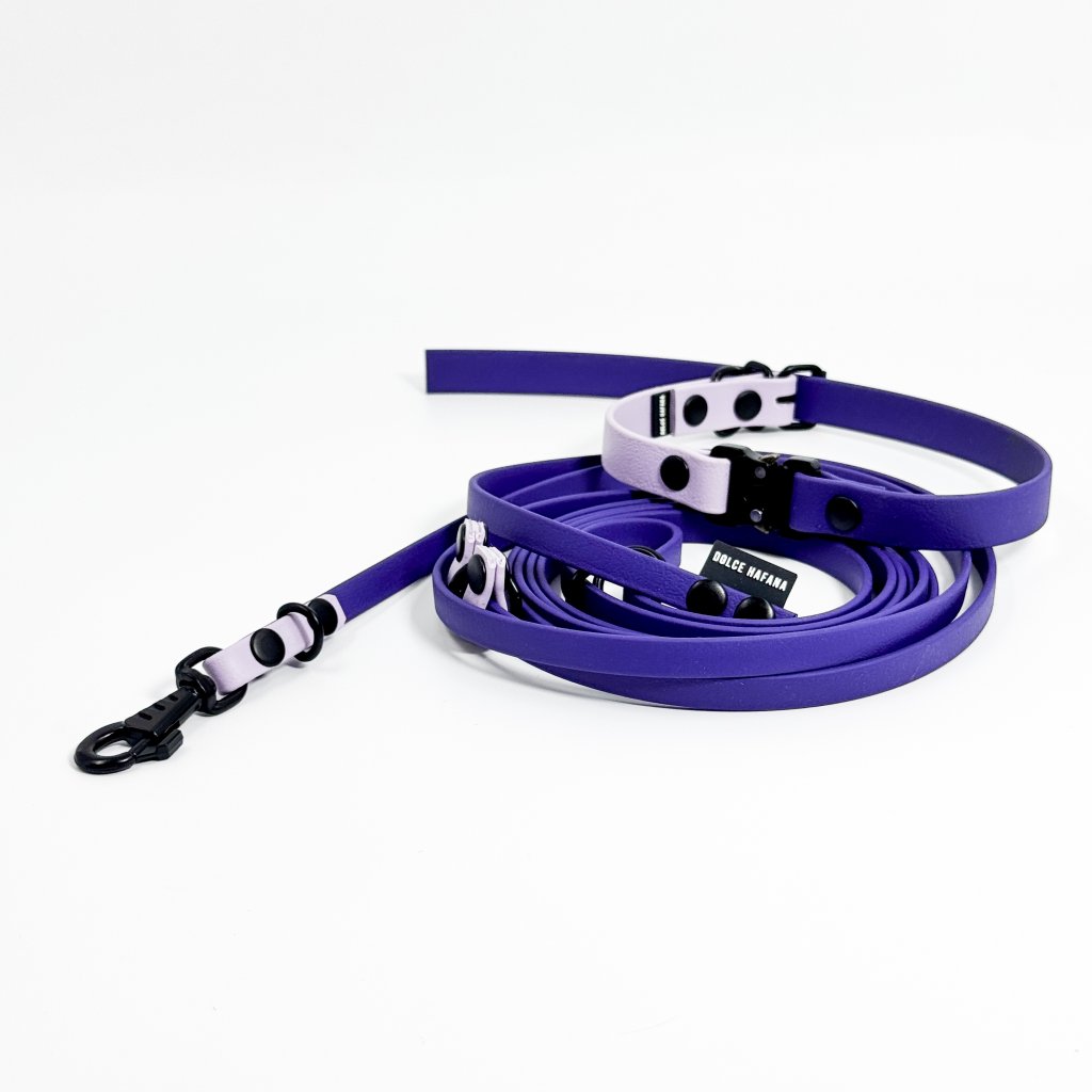 Celý set Tactical obojek Mini v šíři 1.6 cm s přepínacím vodítkem Mini délky 300 cm. Set je v levandulové a fialové kombinaci barev s černými komponenty.