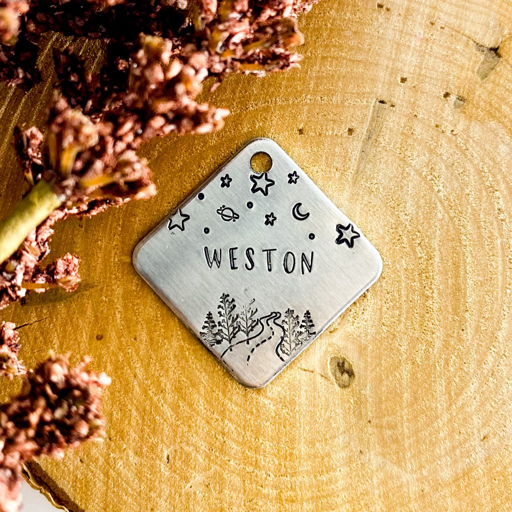 Ručně ražená známka pro psa s nerezovým kroužkem pro uchycení k obojku s motivem Mountain.